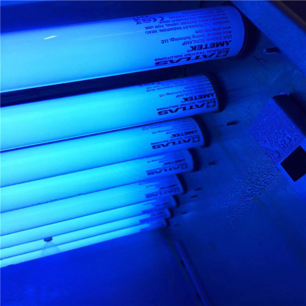 還有客戶會(huì)問到可不可以把UVA-340的燈管放在工作室的一面,UVB-313 的燈管放在另一面?這樣是不能的,這樣得出來的試驗(yàn)數(shù)據(jù)不準(zhǔn)確而且沒有意義,因?yàn)樵趯?shí)際測試時(shí),把UVA340和UVB313這兩種不同的燈管同時(shí)放在紫外老化試驗(yàn)箱的工作室中會(huì)導(dǎo)致照射在樣品上的紫外線光相互的干擾,試驗(yàn)箱內(nèi)的每個(gè)樣品架的背面燈管中反射少量UV紫外線,并照射到另一惻的樣品上。所以如果把UVA340和UVB313燈管分別放置在紫外試驗(yàn)箱工作室的兩側(cè),你會(huì)看到試樣上面有明顯的條紋,而且通過目測或者更為科學(xué)的用光譜儀測試,顯示出試樣的不同老化程度.