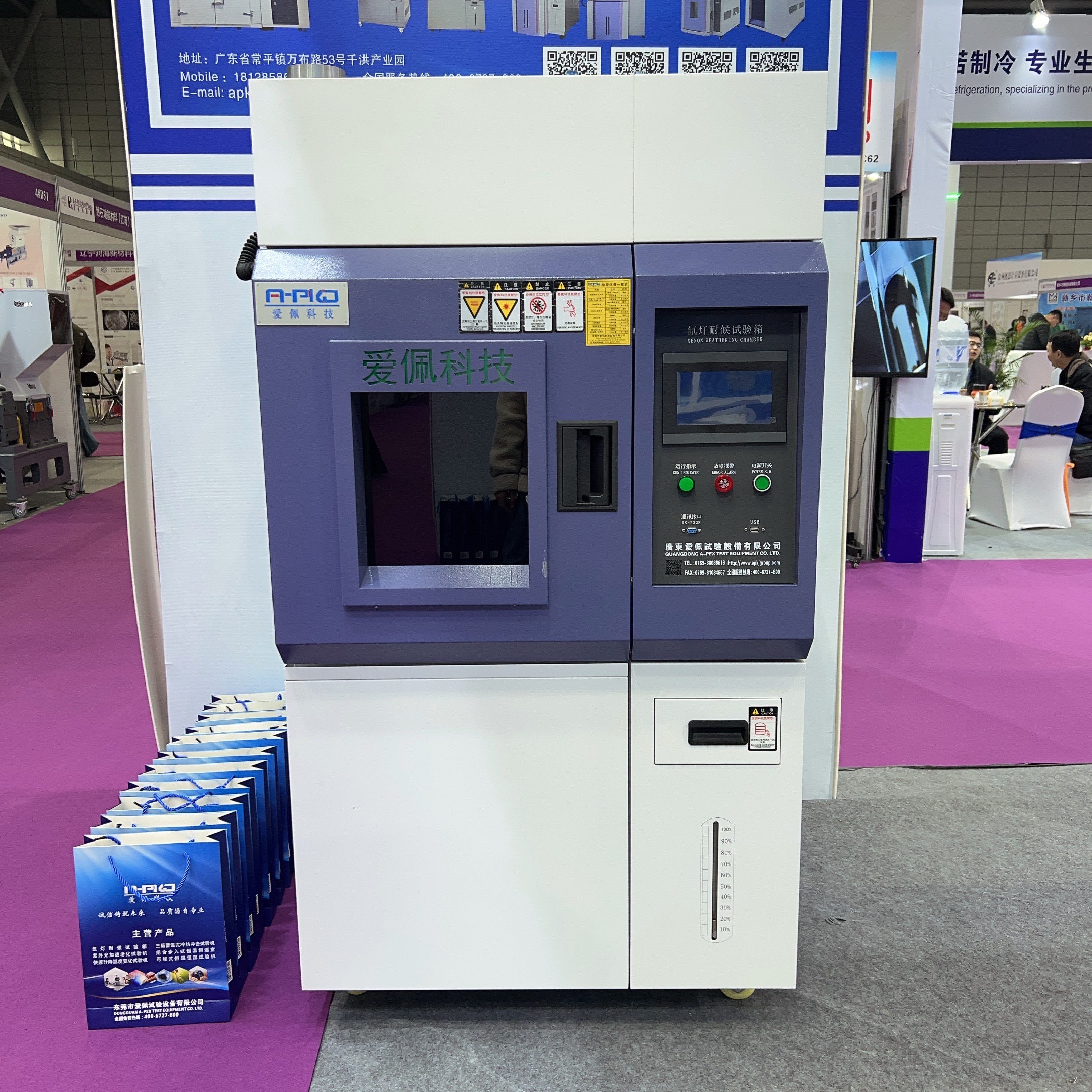 廣東愛佩試驗設備有限公司生產的全光譜氙燈光源嚴格按照國家標準生產,所有氙燈老化試驗箱均可提供精準的測試參數控制,包括輻照度、光譜、相對濕度、箱體溫度和黑板/黑標溫度,另外還配備了水噴淋功能與冷凝功能。